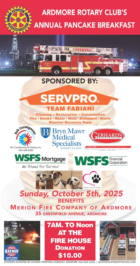 Join us for Ardmore Rotary Club’s Annual Pancake Breakfast, Sunday October 5th 2025, 7AM-Noon at Merion Fire Company of Ardmore